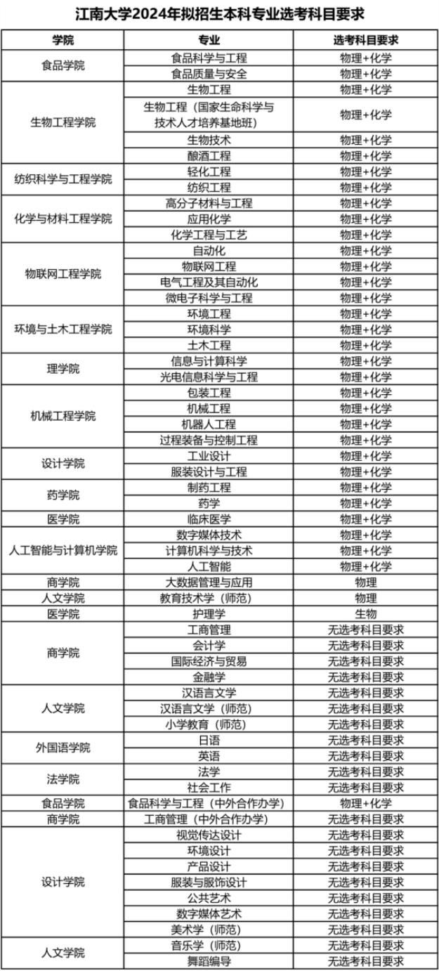 特别说明:一是本选考科目要求为学校在所有实施高考综合改革省份的选科要求,招生当年并非所有专业都会在各省投放招生计划;二是对于高考实行“3+1+2”模式的省份,学校在招生当年根据实际情况投放各省物理类和历史类招生计划,并非所有相关专业都会投放物理类和历史类招生计划。综上,2024年学校在各省实际招生的专业及选考科目要求,以及相关专业是否分别投放物理类和历史类招生计划,以招生当年各省级招生考试机构公布的我校招生计划为准。