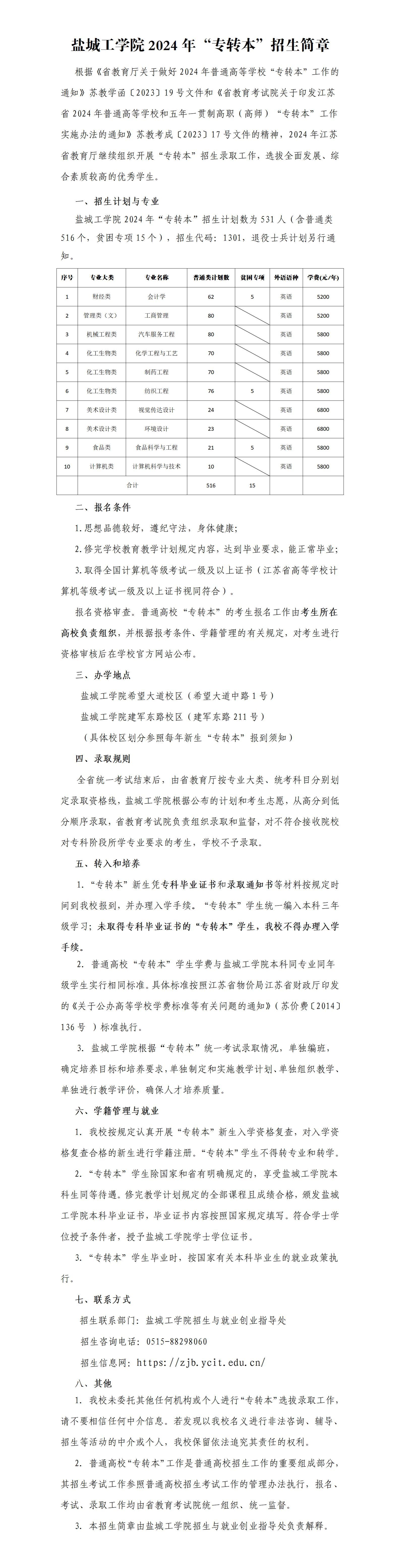 2024年 : 盐城工学院2024年“专转本”招生简章