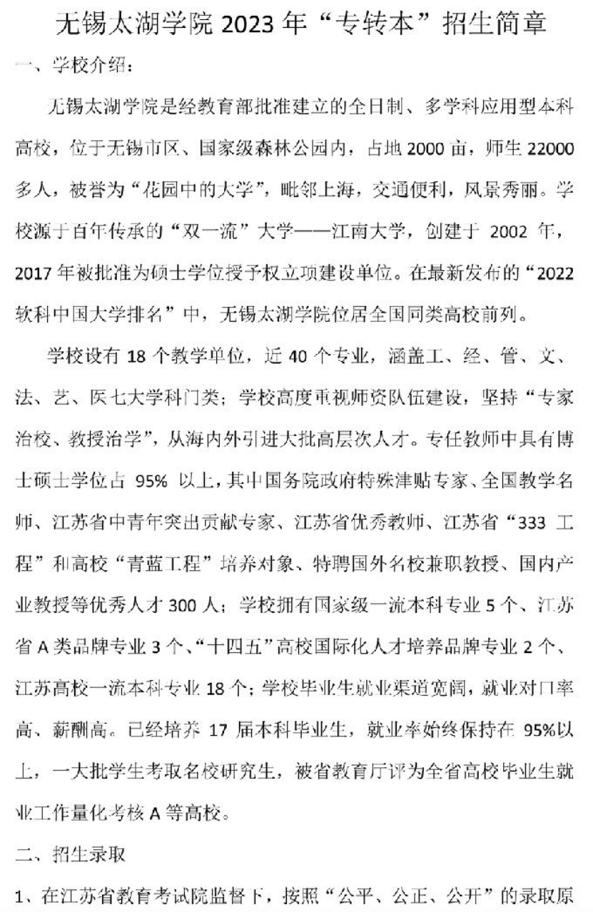 2023年 : 无锡太湖学院2023年“专转本”招生简章