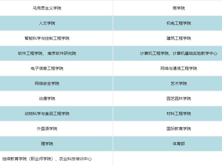 设有马克思主义学院、商学院、人文学院、机电工程学院、智能科学与控制工程学院、建筑工程学院、软件工程学院、计算机工程学院、电子信息工程学院、网络与通信工程学院、网络安全学院、艺术学院、动漫学院、园艺园林学院、动物科学与食品工程学院、材料工程学院、外国语学院、国际教育学院、理学院、体育部等20个二级学院(部)。