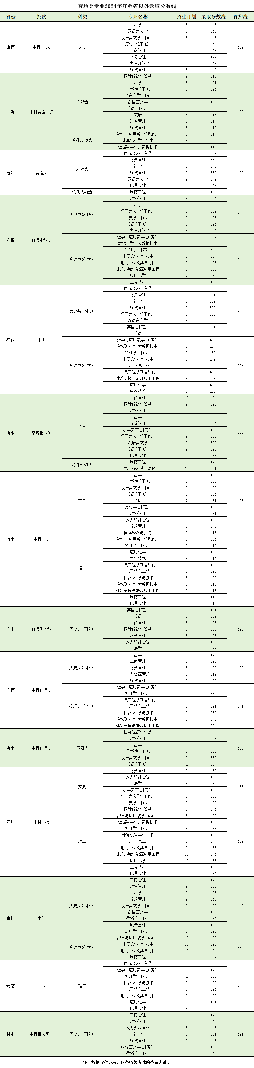 2024年 : 南京师范大学泰州学院-普通类专业2024年江苏省以外录取分数线
