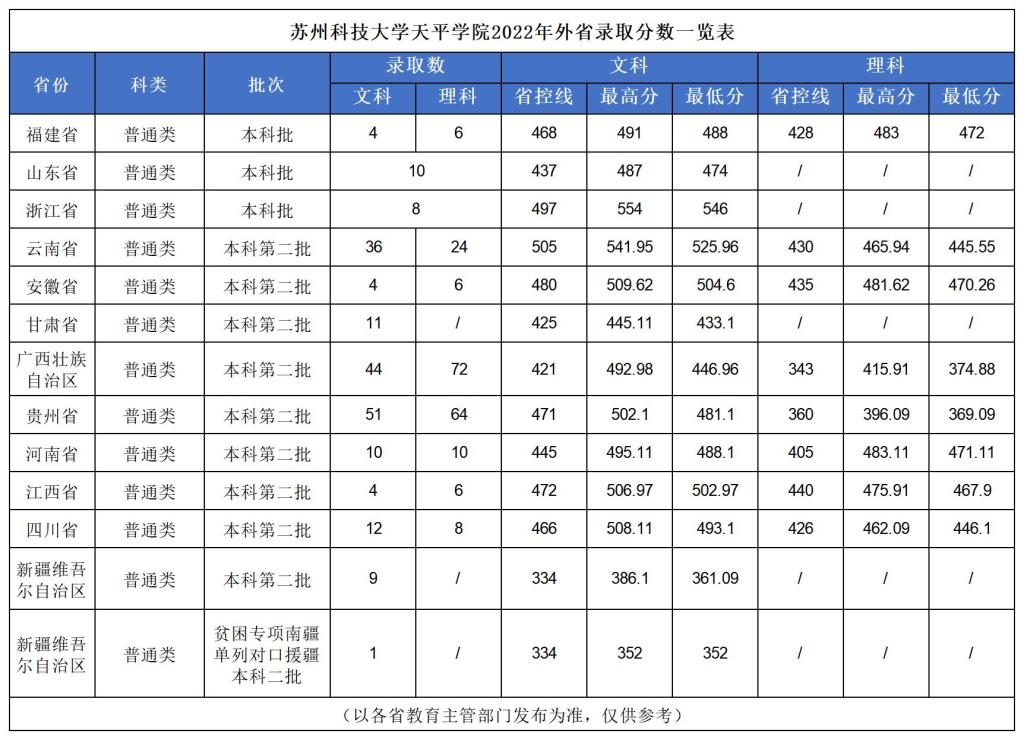 2022年 : 苏州科技大学天平学院-2022年江苏省各专业录取分数线及位次表 / 2022年外省录取分数线一览表