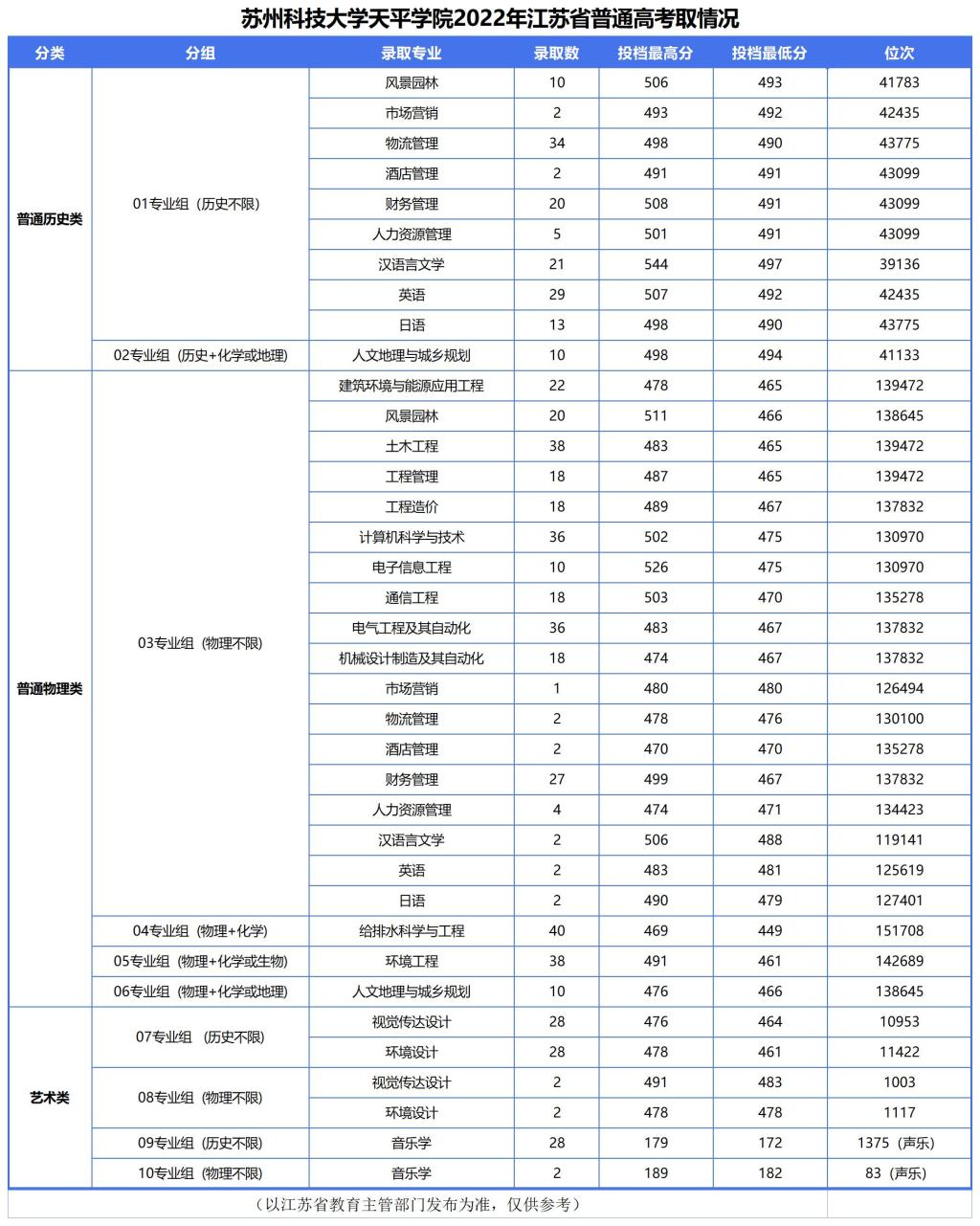 苏州科技大学天平学院-2022年江苏省各专业录取分数线及位次表