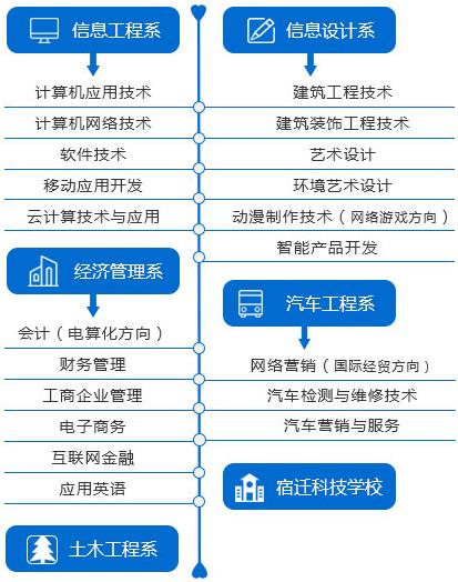 学校下设信息工程学院、信息设计学院、互联网金融学院、网络营销学院。专注IT互联网专业建设、专注职业化自主管理体系、专注校企合作项目实训。学院现有专任教师190余人,其中副教授及高级职称10人、省级教学名师2人、省级专业带头人6人、省级教坛新秀4人,另聘校外兼职教师60多人,特聘客座、兼职教授、著名专家48人。学院建有现代化的教学和实训大楼,建筑面积16万平方米。2000平方米的图书馆和资料室藏书14.9万册,报刊杂志30余种,建有电子阅览室,电子刊物1000余种。学院教学设施齐全,设有20个实训室。在校外建立各类专业实习实训基地200多处,充分满足学生实训需要。其中计算机应用技术和建筑工程技术专业是省级紧缺人才培养基地,会计电算化、计算机网络技术、两个专业是省级教学改革试点专业。现代制造技术实训中心是中央财政支持的重点建设项目,建筑工程技术专业实训中心是中央财政支持建设的职业教育实训基地,会计电算化实训中心是省级示范实训中心。