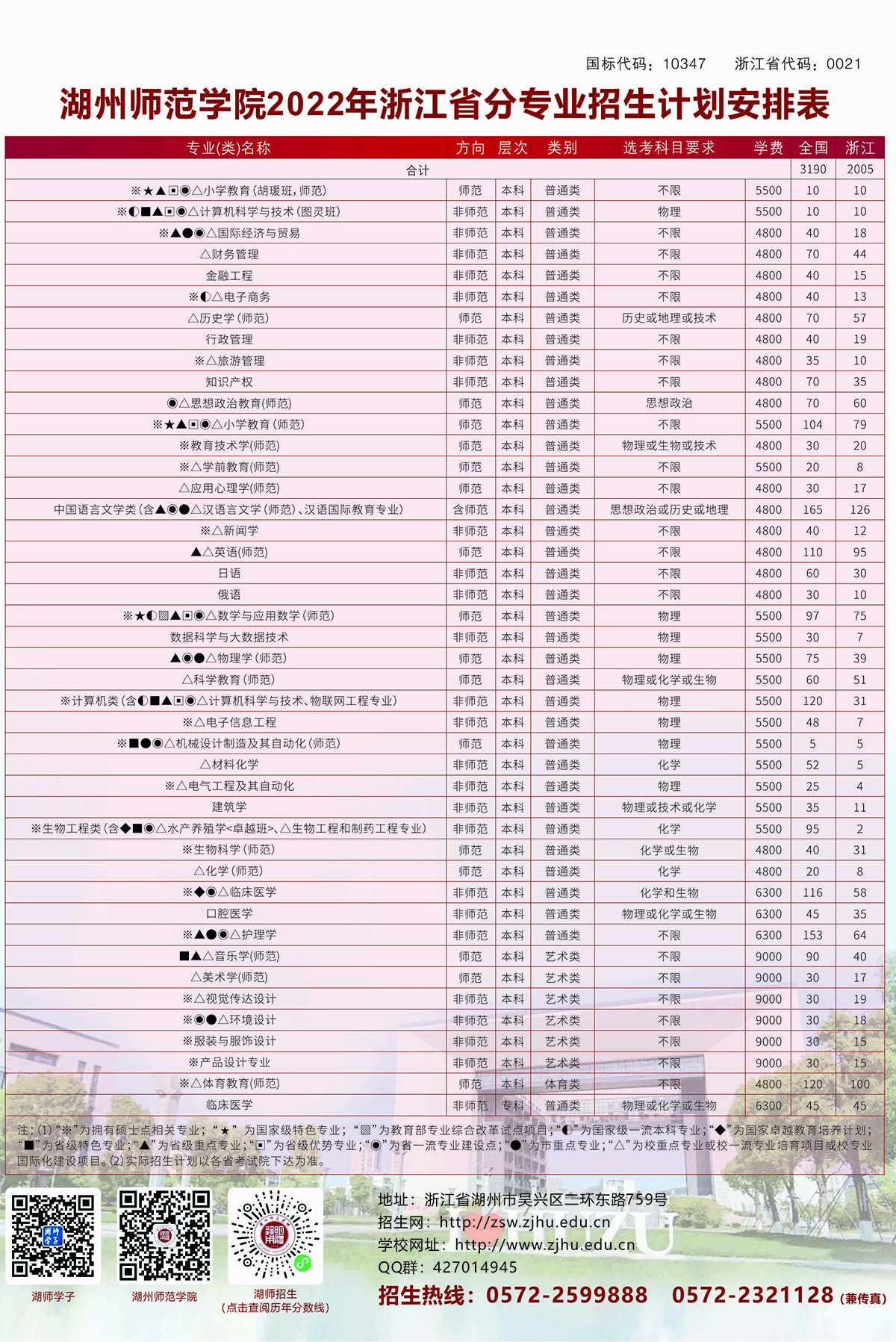 2022年 : 湖州师范学院2022年分省分专业计划安排表