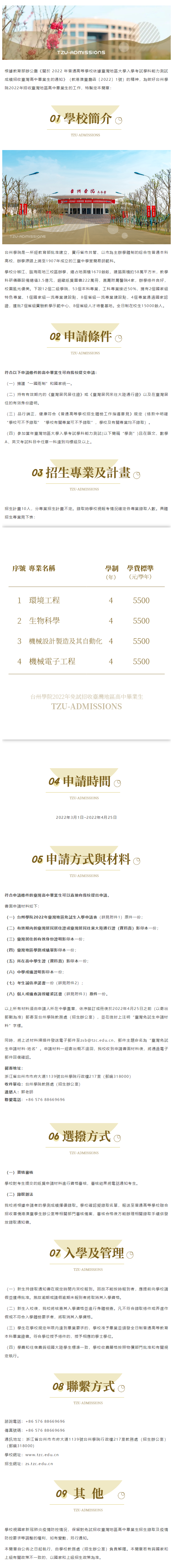 2022年 : 台州學院2022年免試招收臺灣地區高中畢業生招生簡章