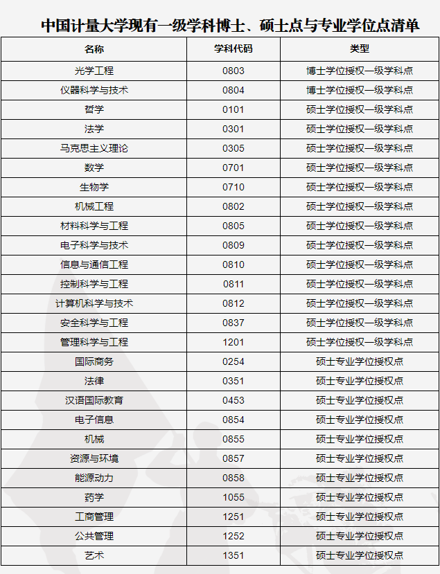 中国计量大学现有一级学科博士、硕士点与专业学位点清单
