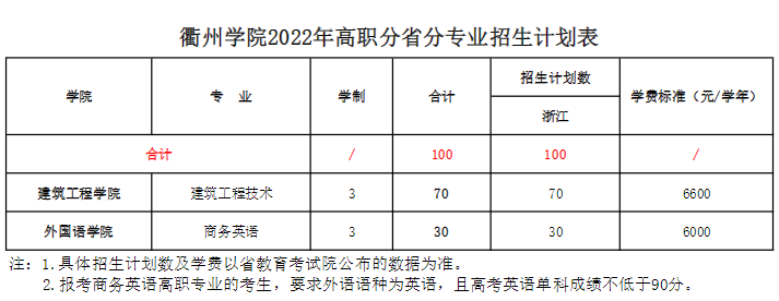 2022年 : 衢州学院2022年高职分省分专业招生计划表