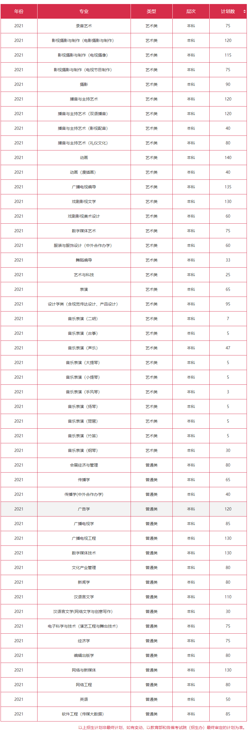 2021年 : 浙江传媒学院2021年招生计划