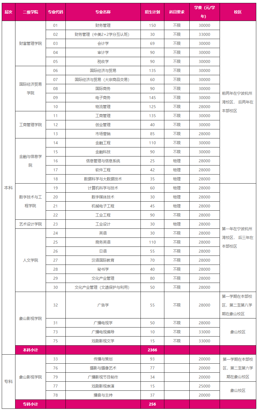2022年 : 2022年宁波财经学院单考单招招生计划(浙江省)