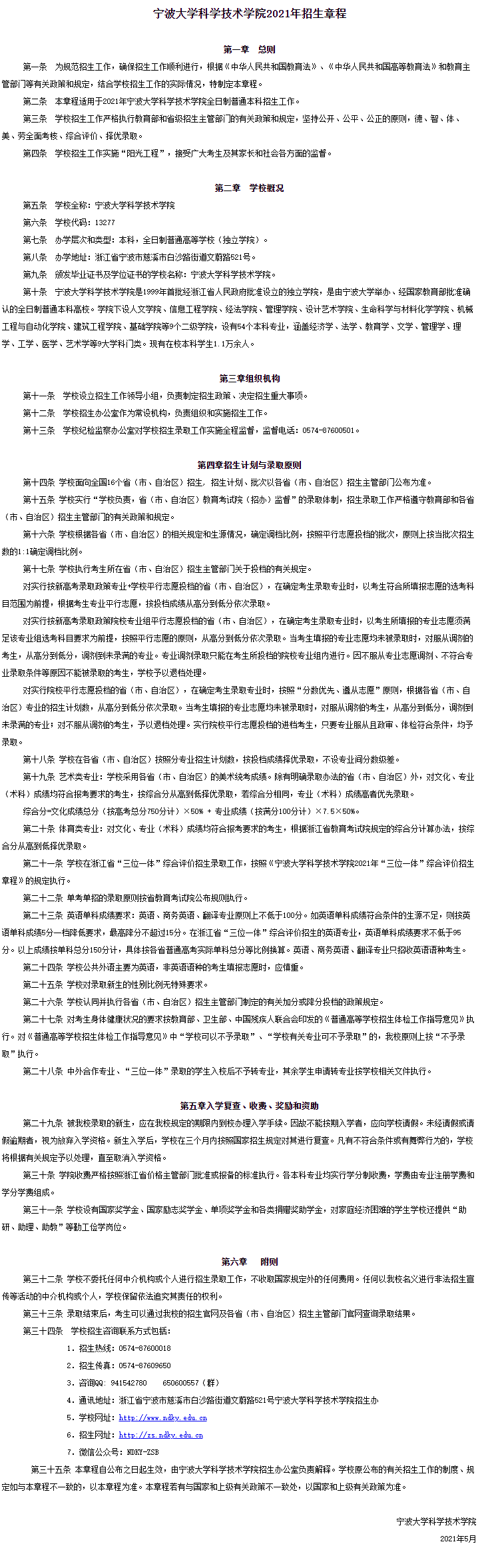 2021年 : 宁波大学科学技术学院2021年招生章程