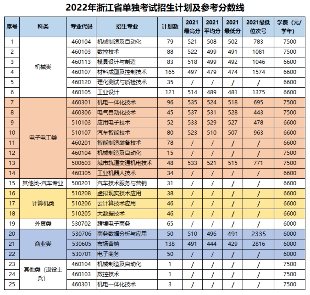 浙江机电职业技术大学-2022年各省市自治区招生计划