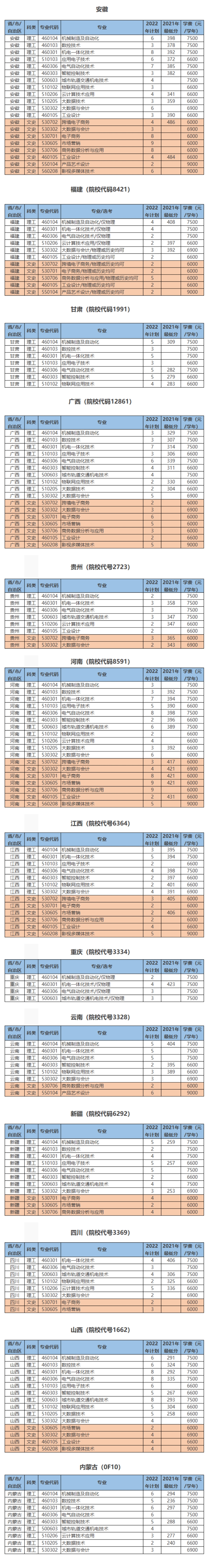 2022年,我校面向浙江、安徽、山西、内蒙古、福建、江西、河南、广西、重庆、四川、贵州、云南、甘肃、新疆等省市自治区招生。具体专业计划和参考分数线如下: