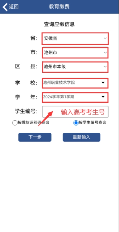 (三)选择“按学生编号查询”,然后依次选择“安徽省”——“池州市”——“池州市本级”——“池州职业技术学院”——“2024学年第1学期”,在“学生编号”输入框输入你的高考考生号,点击“下一步”。