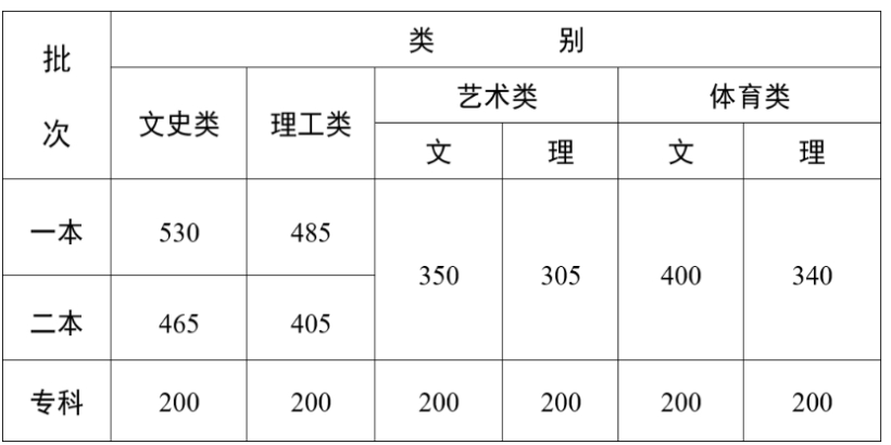 四、体育类专业的录取由文化分数线和体育统考分数线双线控制。各批次的录取最低控制分数线分别为: