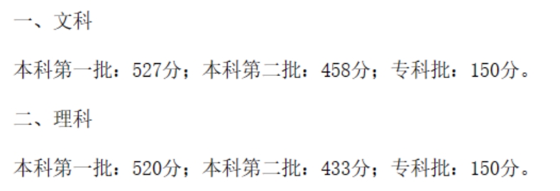 (一)文史类:第一批490分;第二批418分。