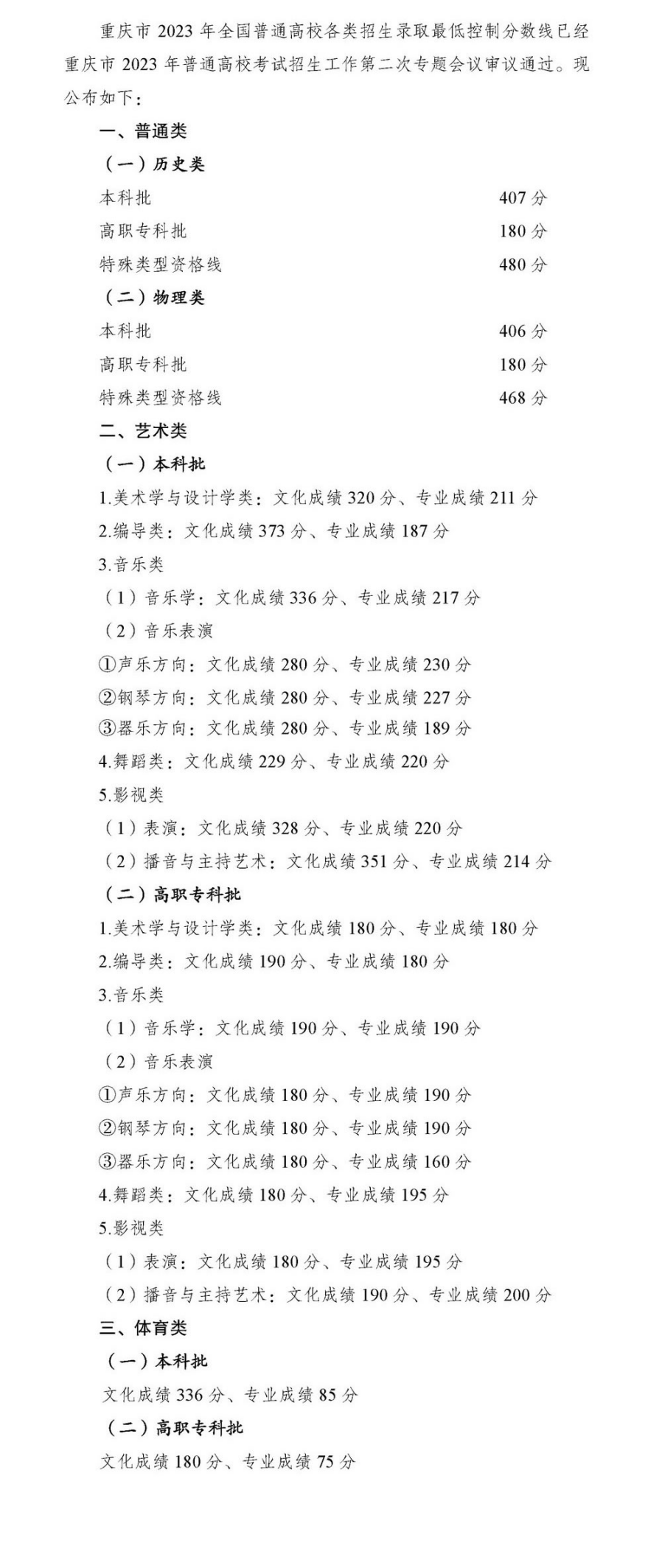 重庆市2023年全国普通高校各类招生录取最低控制分数线