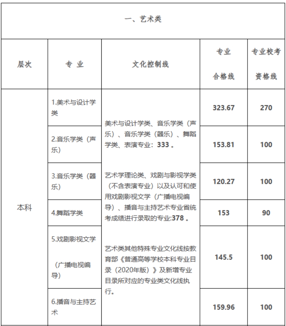 五、艺术类专业的录取由文化分数线和艺术统考分数线双线控制。各批次的录取最低控制分数线分别为: