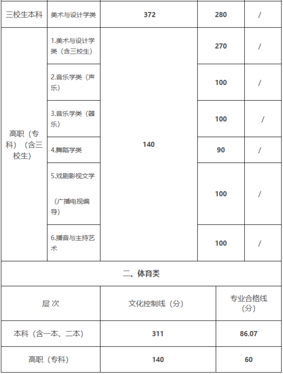 (二)报考体育类考生高考总分须达到体育类录取控制分数线,且体育专业术科测试成绩合格。本科体育专业术科测试合格线文史类64分,理工类68分;高职(专科)体育专业术科测试合格线60分。