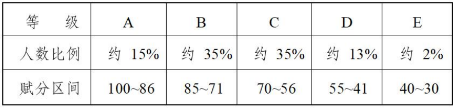 具体转换步骤如下:第一步,按照每门选择性考试科目考生的原始分从高到低划定A、B、C、D、E共五个等级,各等级人数所占比例分别约为15%、35%、35%、13%和2%,将考生的原始分转换成等级。第二步,将A至E五个等级内的考生原始分,依照等比例转换方法,分别对应转换到100~86、85~71、70~56、55~41和40~30五个分数区间,得到考生的等级分。每门选择性考试科目等级分数的转换基数为实际参加该科目考试并取得有效成绩的人数。具体选择性考试科目等级分转换方法及示例如下: