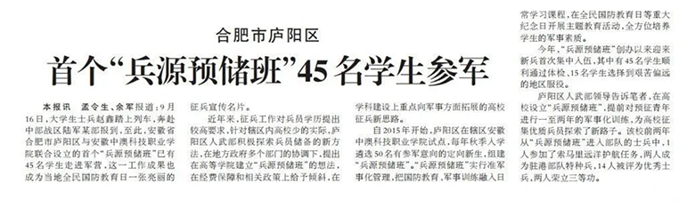与庐阳区人民政府、庐阳区人民武装部共建“兵源预储班”,实行半军事化教学与管理,育人成效明显,受到人民网、新华网等数十家主流媒体宣传报道。