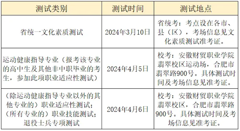 (2)考试内容:考试全部为客观性试题,题型均为单项选择题。试卷总分300分,考试时间60分钟。具体考试内容参见我校后期于招生信息网公布的《安徽财贸职业学院2024年分类招生考试大纲》。具体考试安排见校考准考证中的“考试须知”。