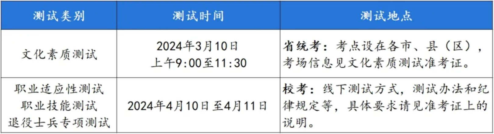 应往届普通高中毕业生参加职业适应性测试,职业适应性测试主要考查考生未来从事生产、建设、服务、管理等一线工作所必备的基本职业素质,包括“思想道德素质”“心理调适能力”“专业认知能力”“自我管理能力”“语言沟通表达能力”“数学逻辑与信息处理能力”均采用线下面试的方式进行,总分300分。