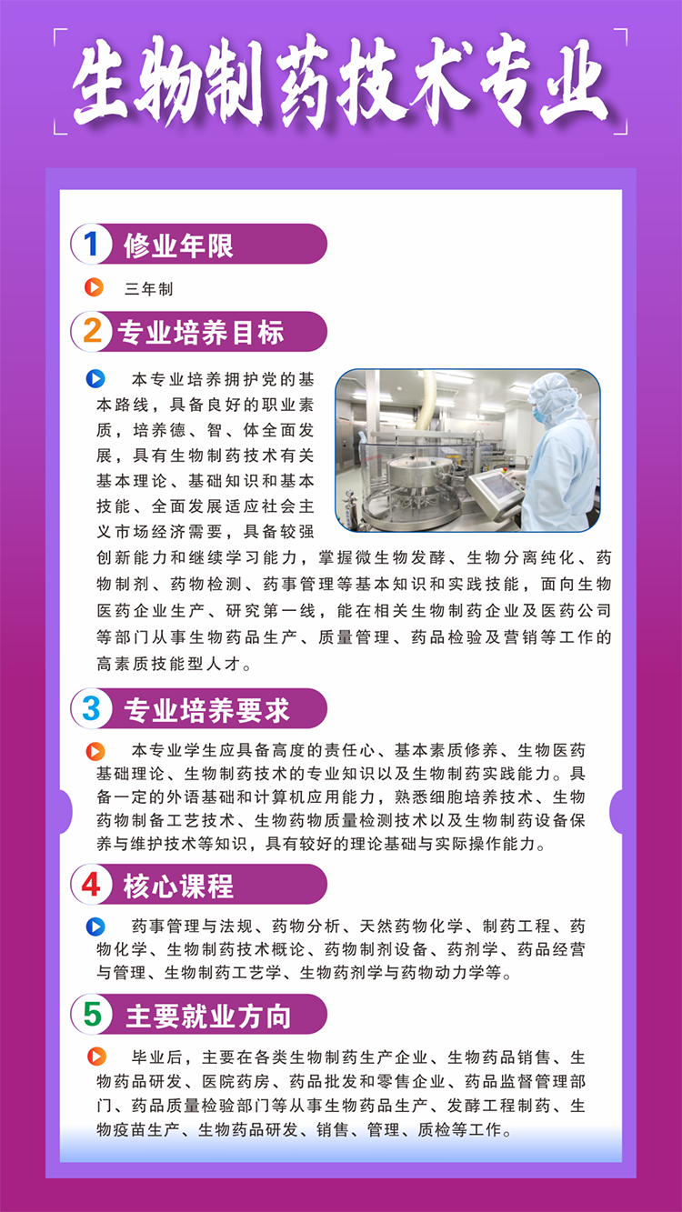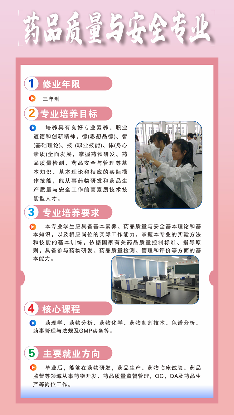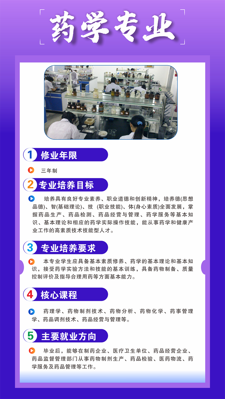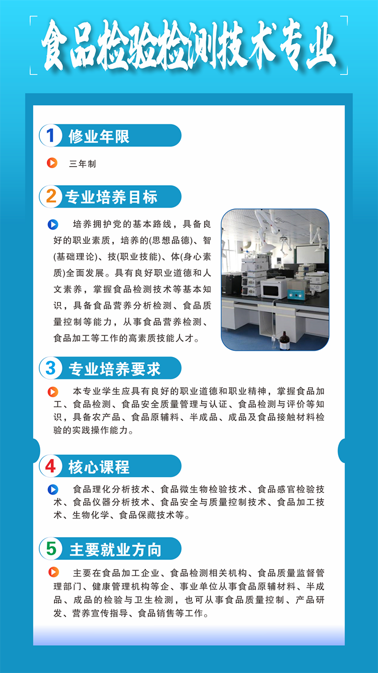 一、培养目标:本专业培养思想政治坚定,德、智、体、美、劳全面发展,综合素质优良,德技兼修、适应时代要求,具备良好的人文素养、职业道德和创新意识,精益求精的工匠精神,较强的就业能力和可持续发展的能力,掌握一定的科学文化水平和医学检验技术专业所需的基本知识和基本技能,面向基层医疗卫生行业和医学检验相关企业,能够从事临床医学检验、输(采供)血、病理技术等工作的高素质劳动者和技术技能人才。