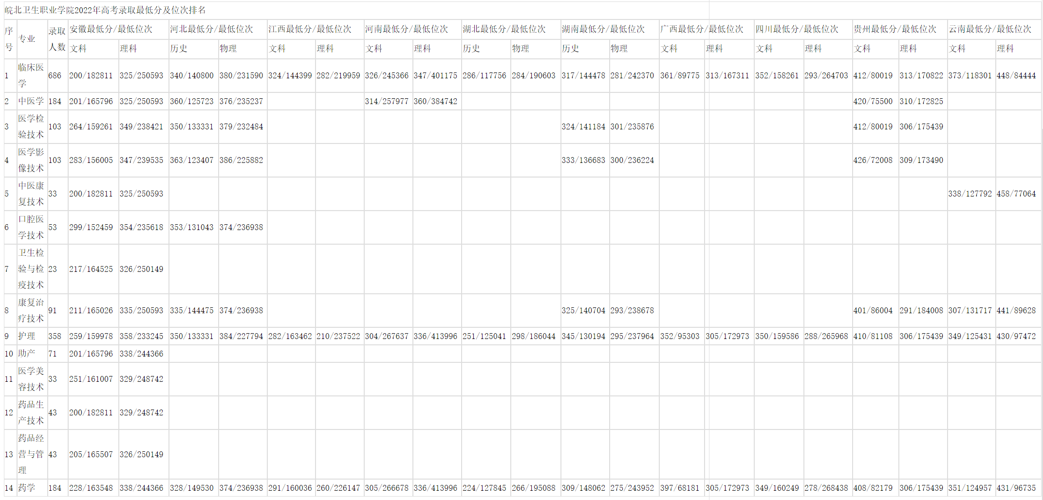 2022年 : 皖北卫生职业学院2022年高考分省分专业录取最低分及位次排名