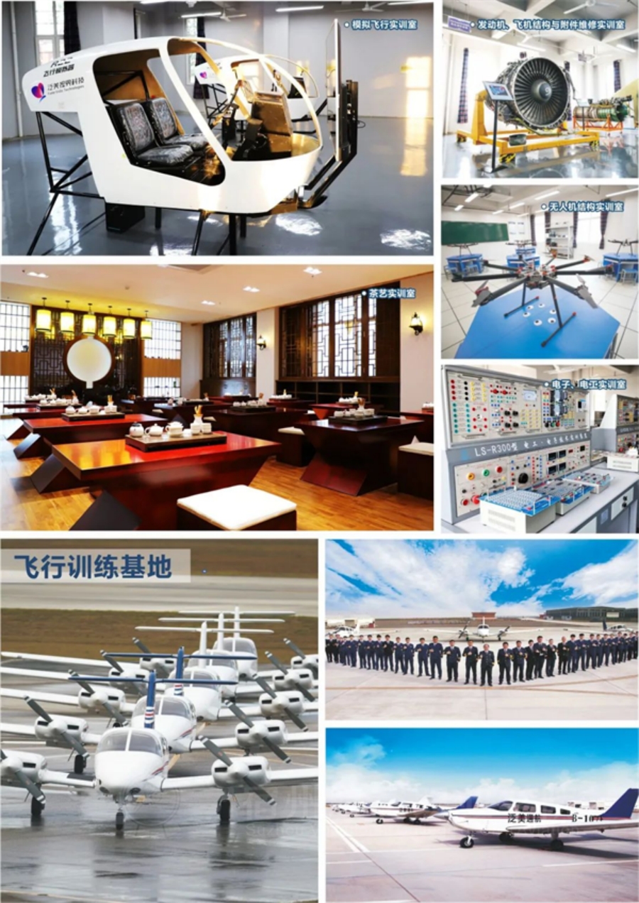 学院拥有领先的航空专业实训设施设备,建立模拟飞行训练中心、乘务实训中心、安检实训中心、机务维修实训中心、民航运输实训中心等航空专业实训中心,包含波音737模拟客舱、空客320模拟客舱、陆地撤离训练舱等先进实训设备,可满足各类民航岗位的实训需求,具备学生培训、区域航空院校集中实训、民航单位入职员工初训、在职员工复训、社会体验、旅游观光6大功能。