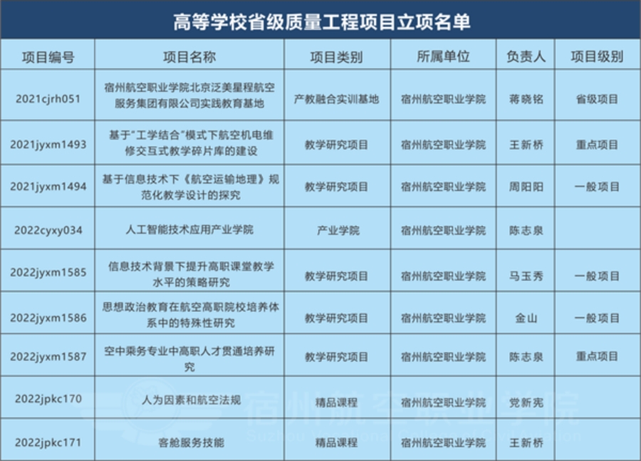 宿州航空职业学院高度重视科学研究,致力于在教学实践工作中发现问题并积极探索解决问题的有效对策,学院组织校内老师积极开展相关研究,不断积累科研经验。其中,获安徽省教育厅开展的高校科学研究、高等学校省级质量工程项目立项13项。