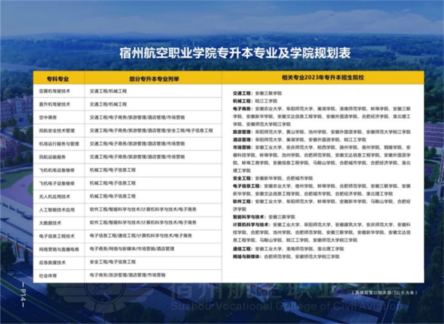 梦幻童话校园、炫酷校园生活,多途径升学、拓展未来空间,行业专家领衔、先进实训中心,深度校企融合、尽享长三角区域优势,依托泛美教育、行业实力雄厚,高品质就业、成就航空梦想,欢迎选择宿州航空职业学院,助你成就精彩人生,从这里走向世界。