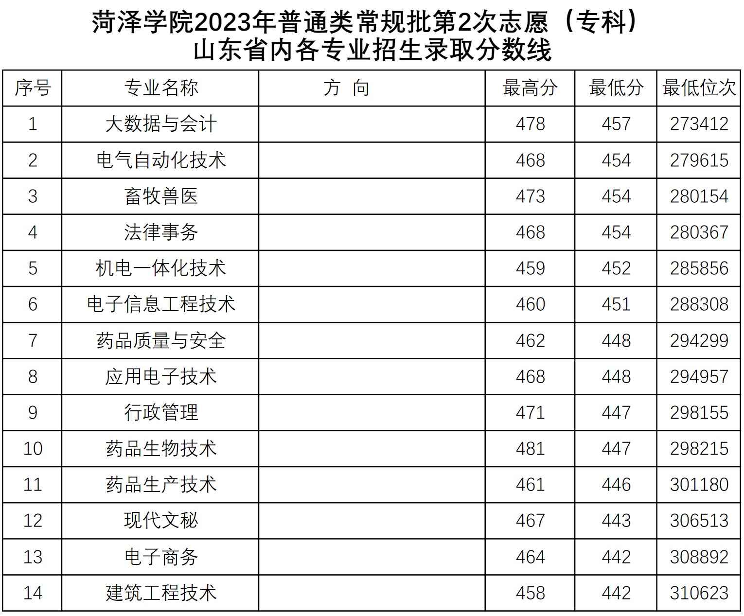 2023年 : 菏泽学院2023年普通类常规批第2次志愿(专科)山东省内各专业招生录取分数线