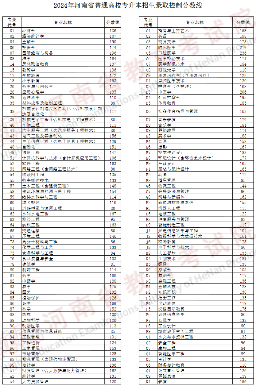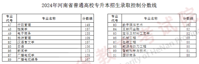 2024年 : 2024年河南省普通高校专升本招生录取控制分数线