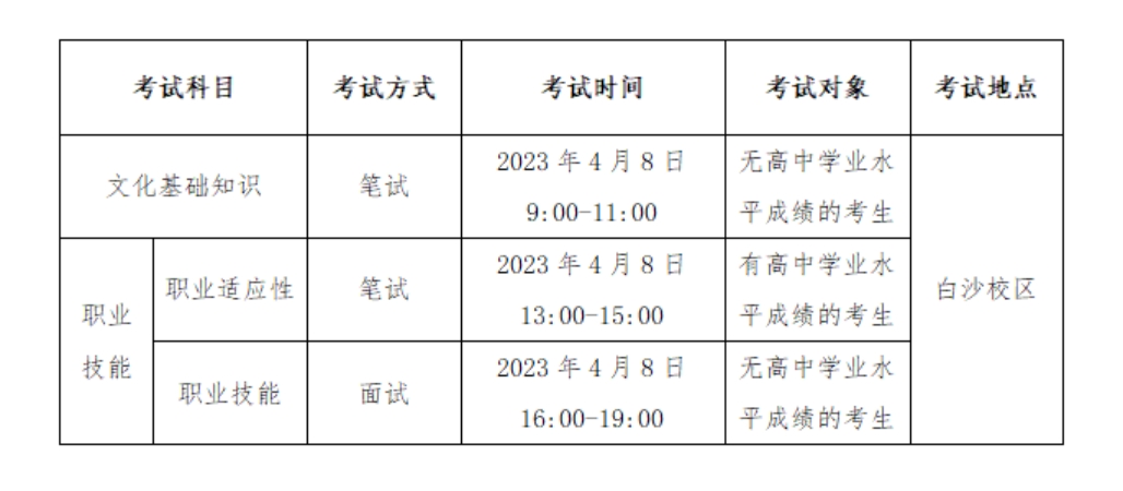 3.退役士兵考生,免文化课考试,按120分计算成绩;需参加学校组织的职业技能测试(面试)180分,满分300分。