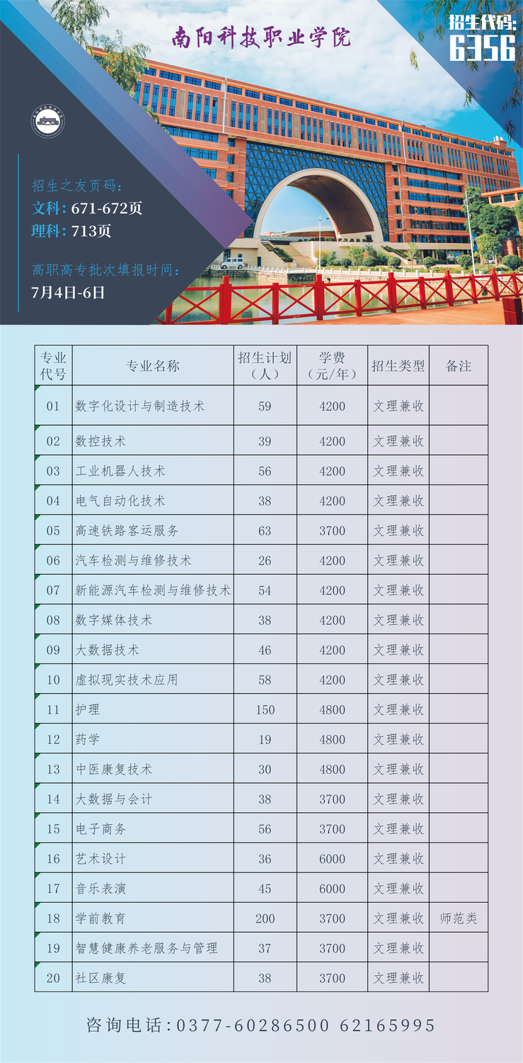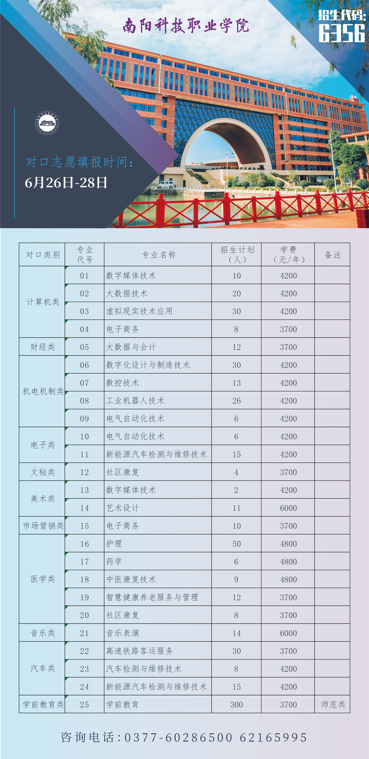 2022年 : 南阳科技职业学院2022年对口批次及高职高专批次专业代号