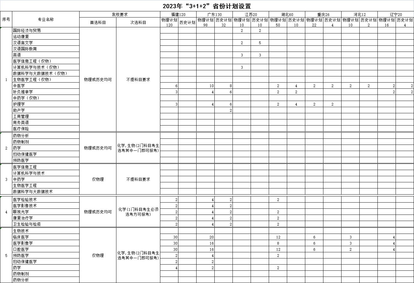 长沙医学院2023年传统高考各省份计划设置