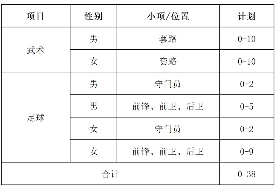 高水平运动队招生计划严格按照教育部的有关规定执行,总规模不超过我校上一年度本科招生计划总数的1%,2023年招生计划38人以内,分项目招生计划如下: