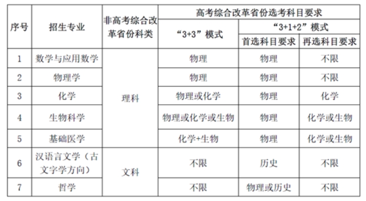 我校强基计划招生专业设置如下:数学与应用数学、物理学、化学、生物科学、基础医学﹑汉语言文学(古文字学方向)﹑哲学。