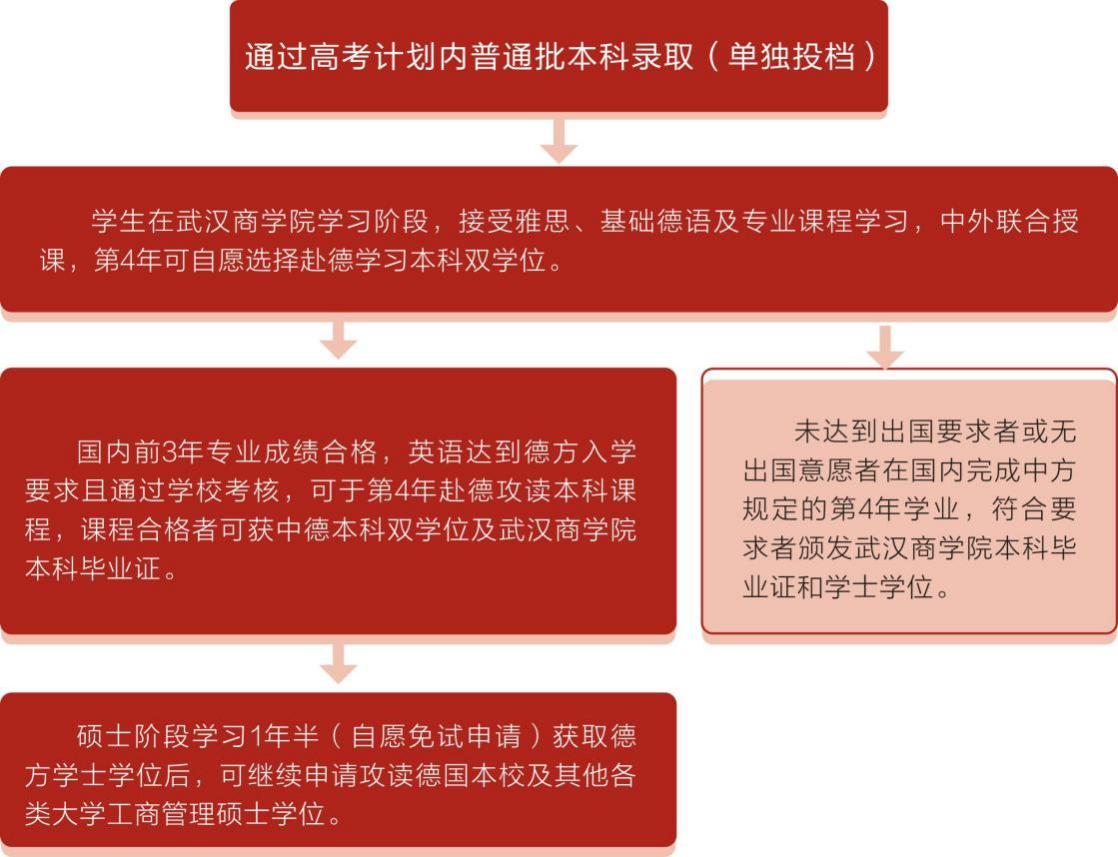 本专业于2015年5月经教育部批准,是武汉商学院与德国埃森经济管理应用科技大学合作举办的本科学历教育项目,批准书编号为:MOE42DE2A20141679N。该专业学制四年,以英语授课为主,学生可以自愿选择采取“3+1”的模式获取中德两校本科双学位,并且在德国可以直接申请攻读工商管理硕士学位。