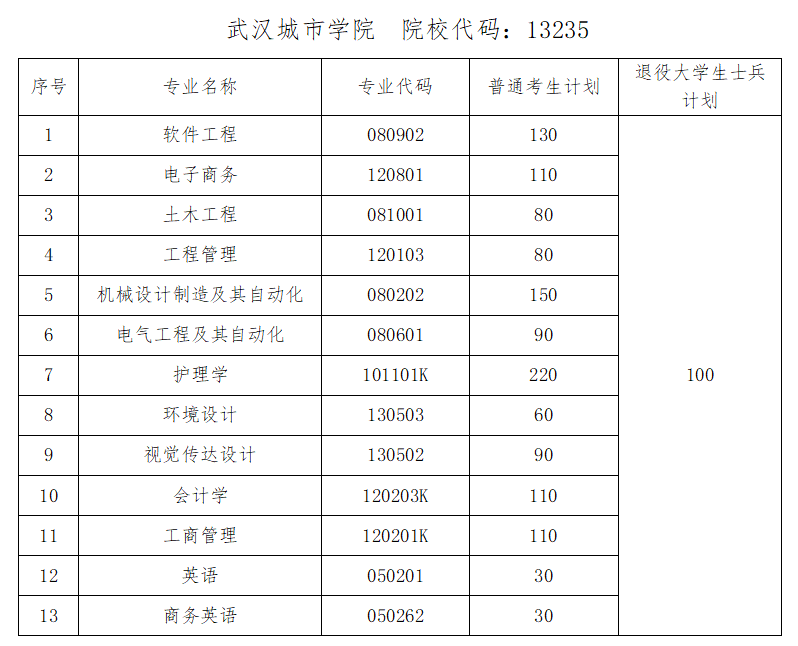 报考专业类别明细见附件《武汉城市学院2025年普通专升本招生专业对高职(专科)专业的报考范围一览表》。普通考生计划报考人数不足的,留待补录解决。退役大学生士兵计划不调整到其他类别计划使用。补录仍完不成的计划,由省教育厅统筹调剂使用。
