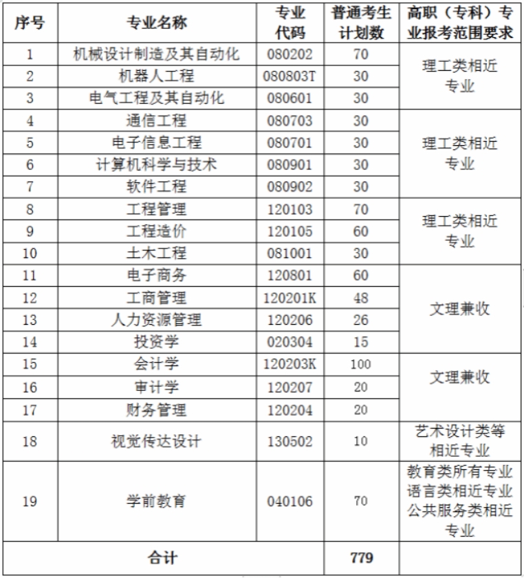 我校专升本招生计划分“普通考生计划”“退役大学生士兵计划”两类。普通考生分专业计划和报考范围要求如下表: