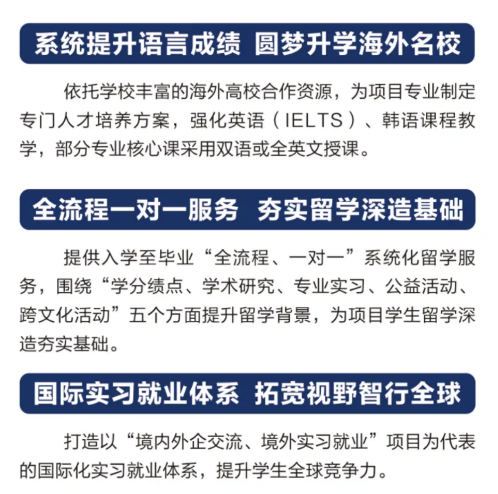 1.中韩校际交流项目专业,将韩语作为必修课,以TOPIK三级作为教学目标,教学周期覆盖第1至第5学期;2.学校与8所韩国名校签署校际交流协议,为学生提供不同层次的目标院校专本直通学习机会;3.项目为学生一对一匹配资深留学导师,在大一入学即指导学生制定留学规划书,一人一案,在校期间,由留学导师进行全程跟踪和动态调整。