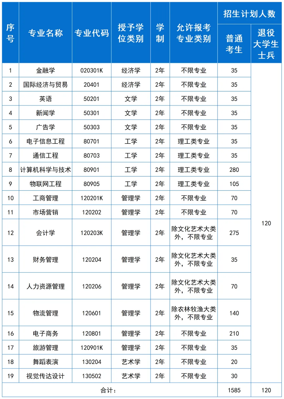 我校专升本招生计划分“普通考生计划”“退役大学生士兵计划”2类。招生专业与分专业计划如下。