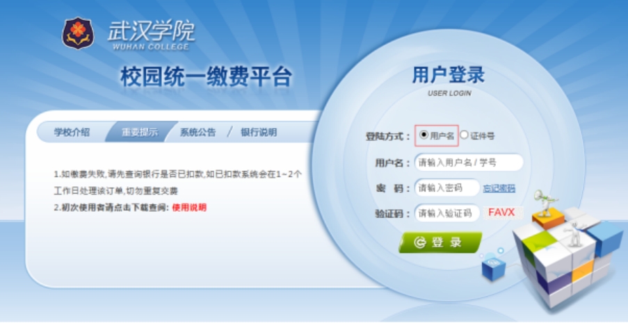 特别注意:武汉学院毕业的学生用户名也必须使用身份证号,不能使用原学号,支持企业微信-工作台-校园缴费登录。