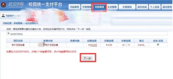 3. 登陆成功后,点击“其他费用”,核对姓名、身份证号及缴费金额