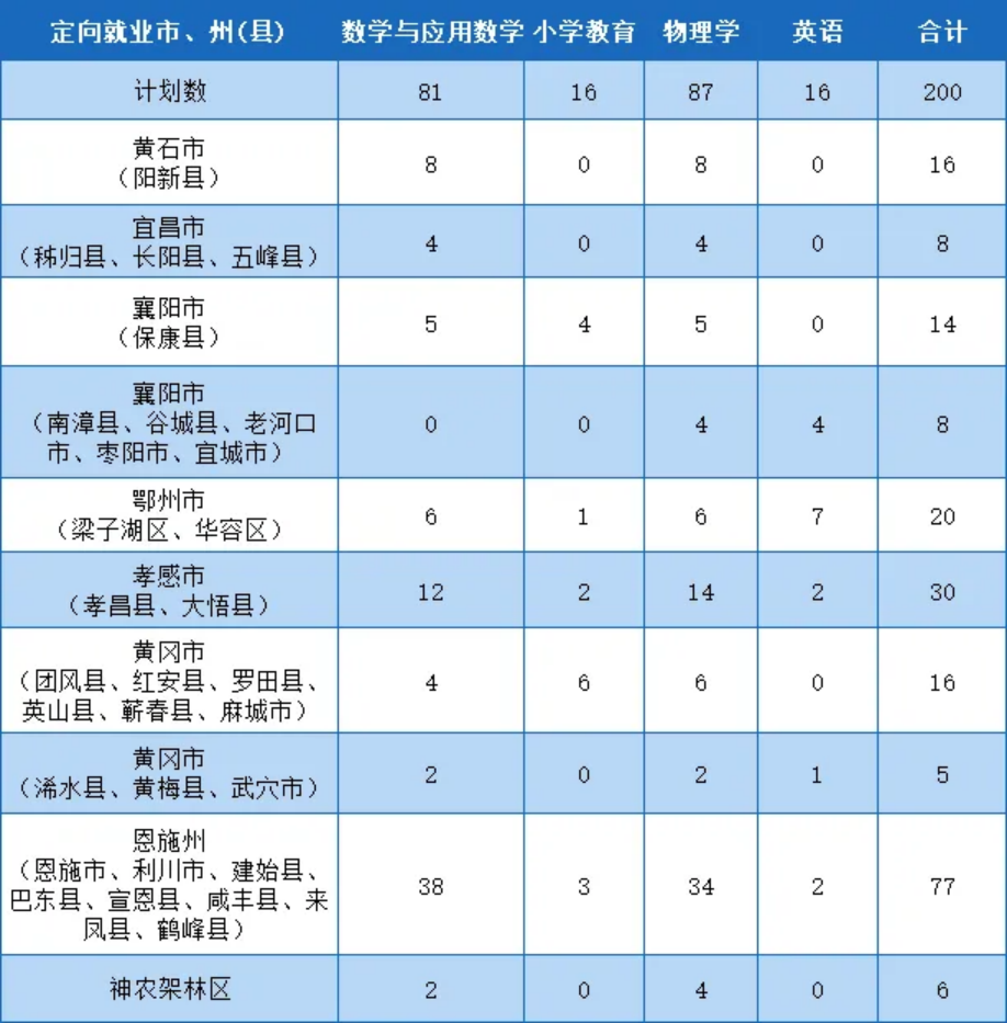 1. 合格的“荆楚优师计划”毕业生,按照签订协议的市(州)所制定考核安置方案安排到该市(州)所辖定向县域中小学任教,入编入岗,履约任教服务不少于6年。我校“荆楚优师计划”师范生定向就业市(县)如下: