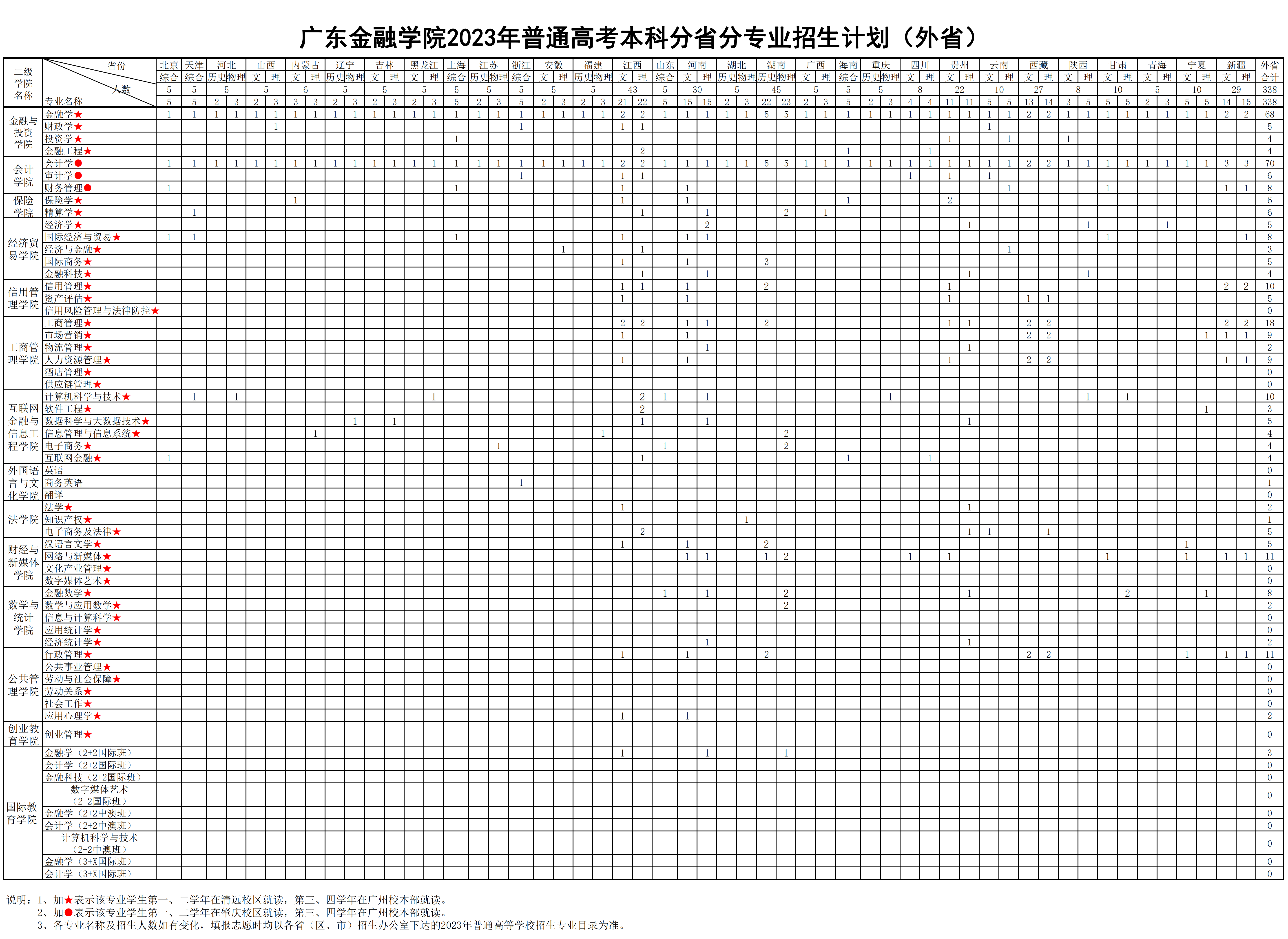 广东金融学院2023年普通高考本科分省分专业招生计划(外省)