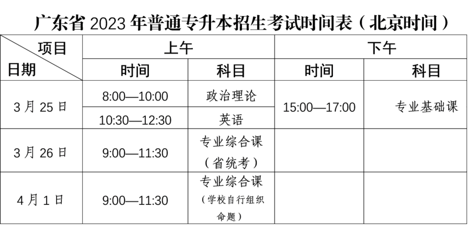 (五)普通专升本招生考试时间为2023年3月25日(星期六)至26日(星期日)两天,具体安排见下表: