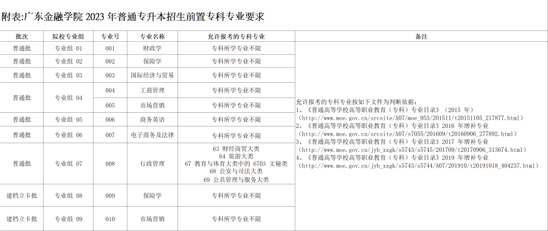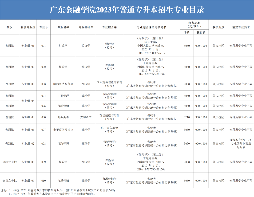 我校2023年普通专升本招生专业为财政学、保险学、国际经济与贸易、工商管理、市场营销、商务英语、电子商务及法律、行政管理等8个专业,其中,保险学和市场营销专业设置建档立卡批次计划。各专业招生批次、考试科目、教学地点、前置专科专业要求详见附件《广东金融学院2023年普通专升本招生专业目录》,招生计划数由广东省招生办公室确定后另行公布。